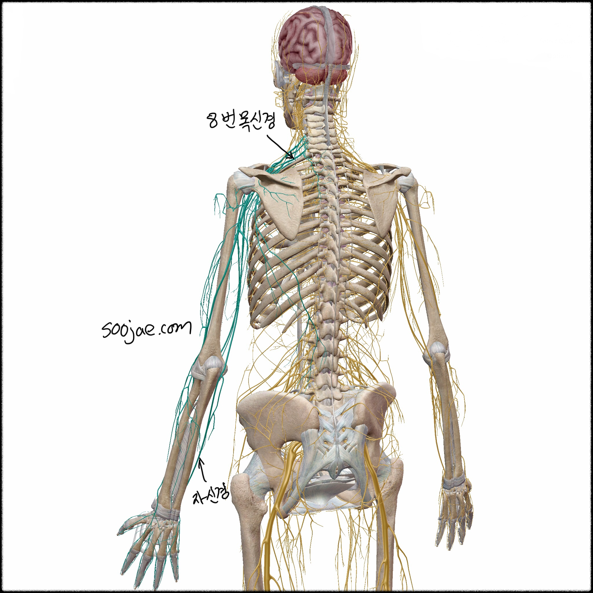 작은 마름근에 의해 7번째 목뼈와 1번째 등뼈가 자극될 때 나타나는 증상은 아래 그림의 팔신경얼기를 보면 쉽게 이해할 수 있다.