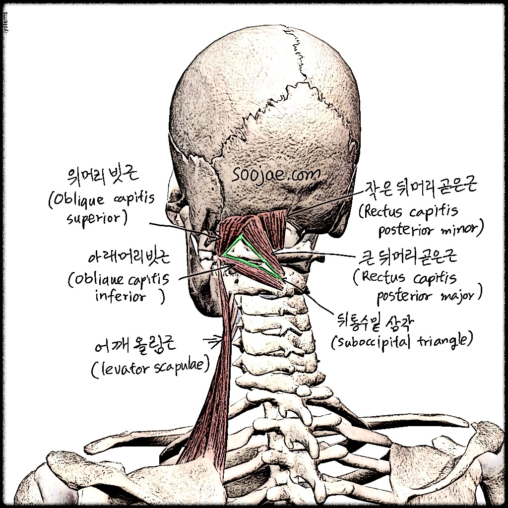 - 닿는곳 (Insertion): 뒤통수뼈 아래목덜미선(하항선)의 안쪽 (Medial part of inferior nuchal line of occipital bone)