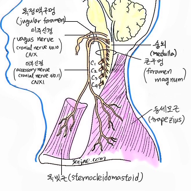 위등세모근과 척수더부신경의 특별한 연결