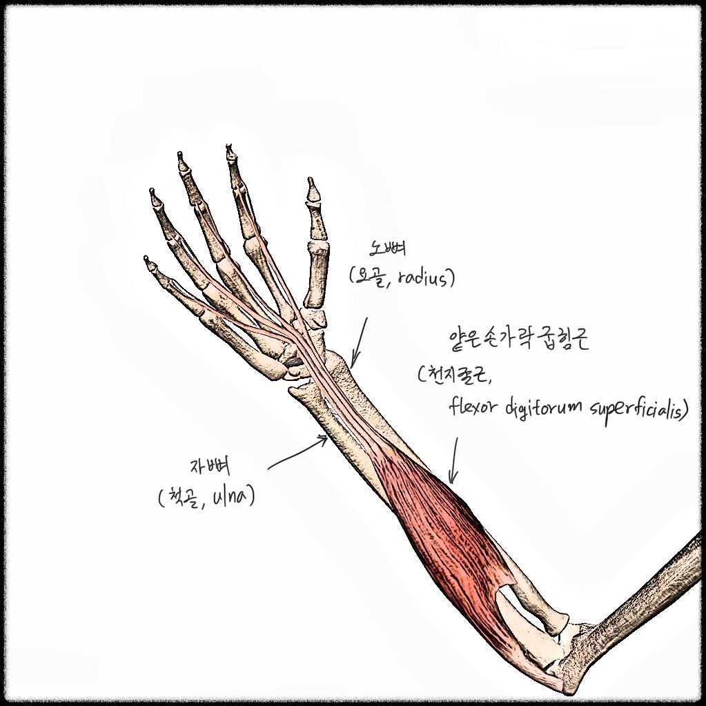 위 그림은 얕은손가락굽힘근과 깊은손가락굽힘근을 보여준다. 얕은손가락굽힘근을 걷어내야 깊은손가락굽힘근이 보인다.