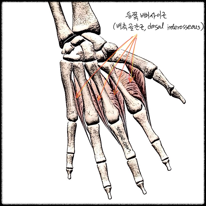 - 둘째 뼈사이근: 둘째 손가락의 손바닥쪽