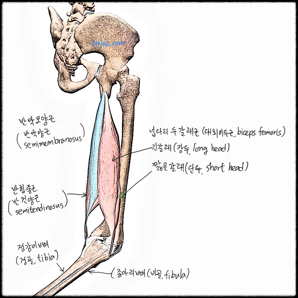 - 기능: 엉덩관절 폄, 무릎 굽힘, 골반 뒤기울임, 종아리 안쪽돌림