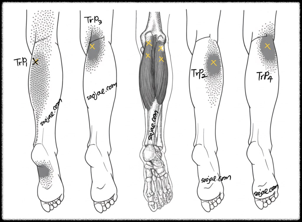 장딴지근의 통증을 S1 신경뿌리병증(Radiculopathy)으로 오해할 수 있다. 참고로, 통증유발점(TrP)의 번호는 문헌마다 다를 수 있으니, 위치와 증상을 알아두길 바란다. 이 글에서는 위쪽 그림에 나온 숫자를 참고로 했다.