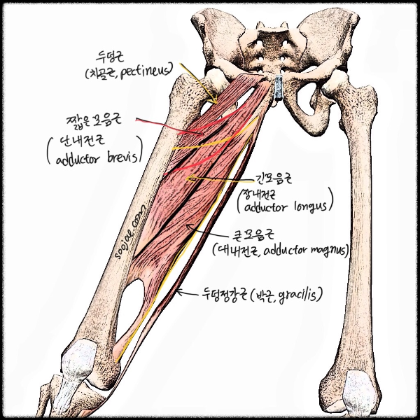 - 정지점: 넙다리뼈 거친선 중간 1/3 (medial part of linea aspera middle 1/3)