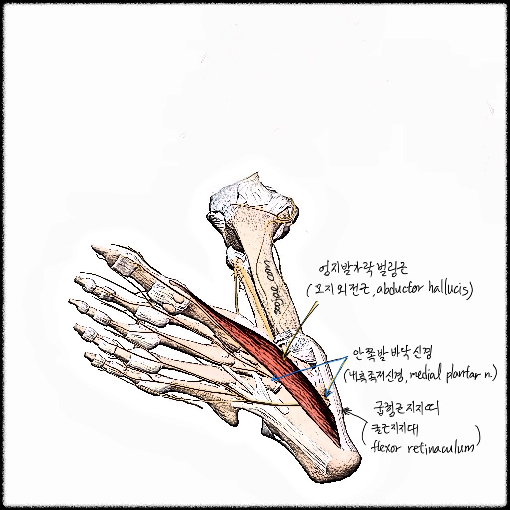또한, AH의 시작점이 굽힘근지지띠 (굴근지지대/Flexor Retinaculum)와 가깝고, 안쪽 발바닥 신경 (내측족저신경/Medial Plantar Nerve)이 AH의 위쪽 경계를 따라 깊숙이 통과한다. 과사용이나 기능부전으로 인해 AH 근육 자체에 경직된 띠나 비대 (과긴장)가 발생하면, 이는 발목굴 증후군 (족근관증후군/Tarsal Tunnel Syndrome)과 같은 안쪽 발바닥 신경 (내측족저신경/Medial Plantar Nerve) 잡힘 (신경포착)을 직접적으로 유발하는 해부학적 덫 (trap) 역할을 할 수 있다.