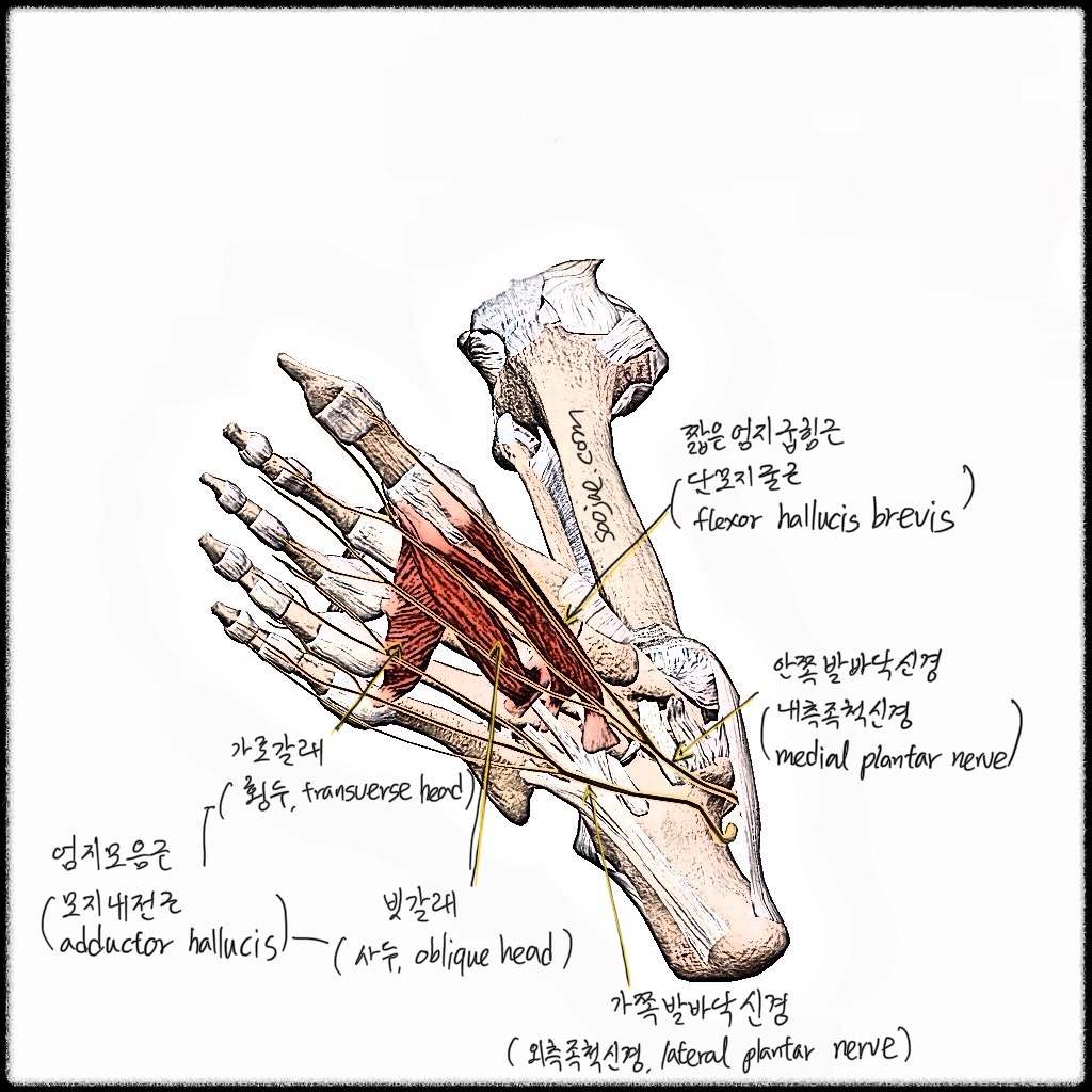 - 빗갈래(Oblique Head): 2번부터 4번 중족뼈의 근위부에서 광범위하게 시작한다.4