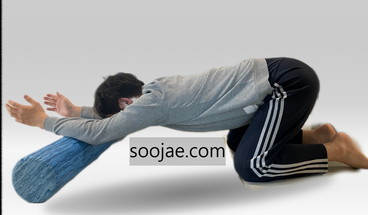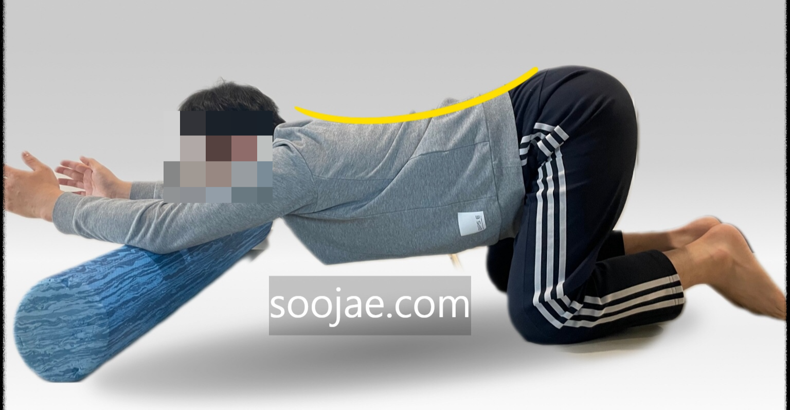 간혹 폼롤러를 통해 운동을 하다 보면 아래 사진처럼 척추 전만 자세로 운동하는 분들이 있다. 이는 허리 부상 위험뿐만 아니라 허리에 영향을 주는 넓은등근 스트레칭에 적절한 자세가 아니다. 첫 번째 사진처럼 척추 중립(등이 살짝 구부러졌지만 이해해 주시라, 그래서 코치가 필요한 것이다)을 유지한 상태(코어 근육 강화에 도움)에서 폼롤러를 밀면서 스트레칭을 한다. 만약 당기는 동작을 한다면 넓은등근 강화가 되는 것이다. 짐볼을 이용한 운동도 마찬가지다.