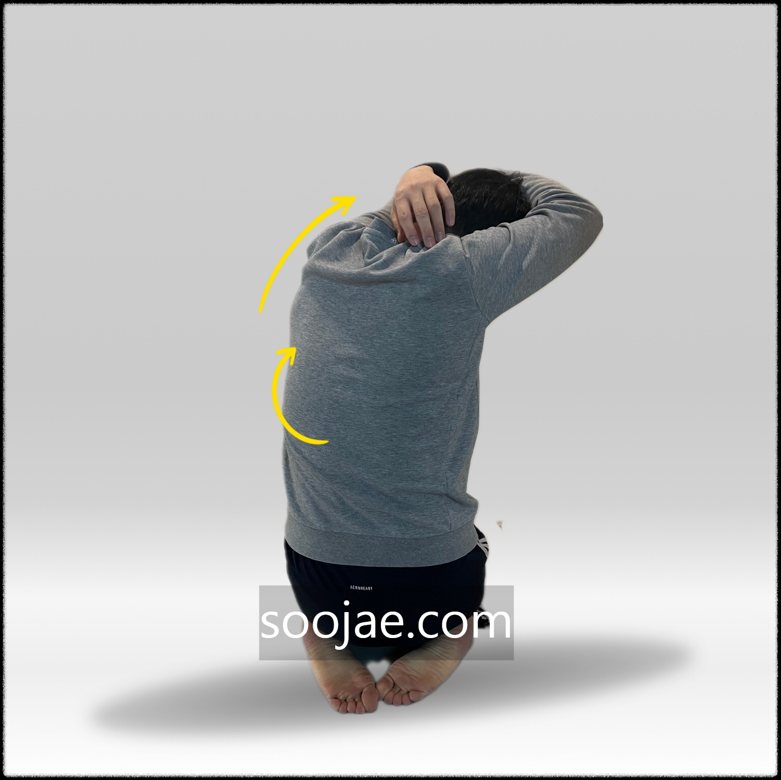 이 스트레칭 법에서 제일 중요한 것은 골반을 고정하는 것이다. 무릎을 꿇거나 의자에 앉아서 하면 된다. 골반을 고정한 후 넓은등근을 스트레칭하려는 쪽의 팔을 머리 위로 올려 팔꿈치를 잡고, 몸을 스트레칭 반대쪽으로 살짝 구부리고, 회전을 하면 된다. 해보시라, 어떤 스트레칭 방법보다 강력하게 느껴질 것이다.