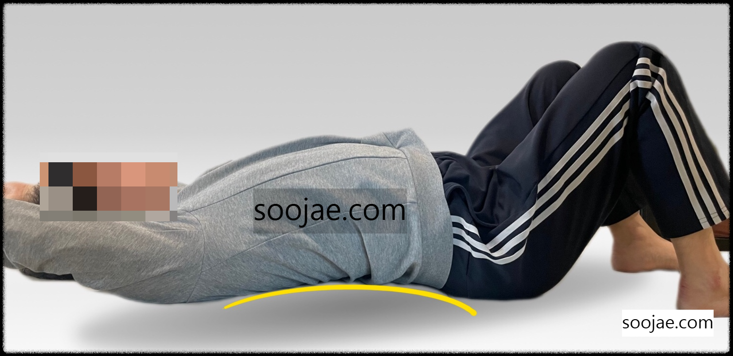 첫 번째 사진처럼 척추가 바닥에 붙었을 때 팔이 뜨거나, 두 번째 사진처럼 팔이 바닥에 붙어도 허리가 뜨게 되면 넓은등근이 짧은 것이다. 두 번째 사진으로 유추해 볼 수 있는 것은 넓은등근이 어깨나 목뿐만 아니라 허리에도 영향을 준다는 것을 알 수 있다.