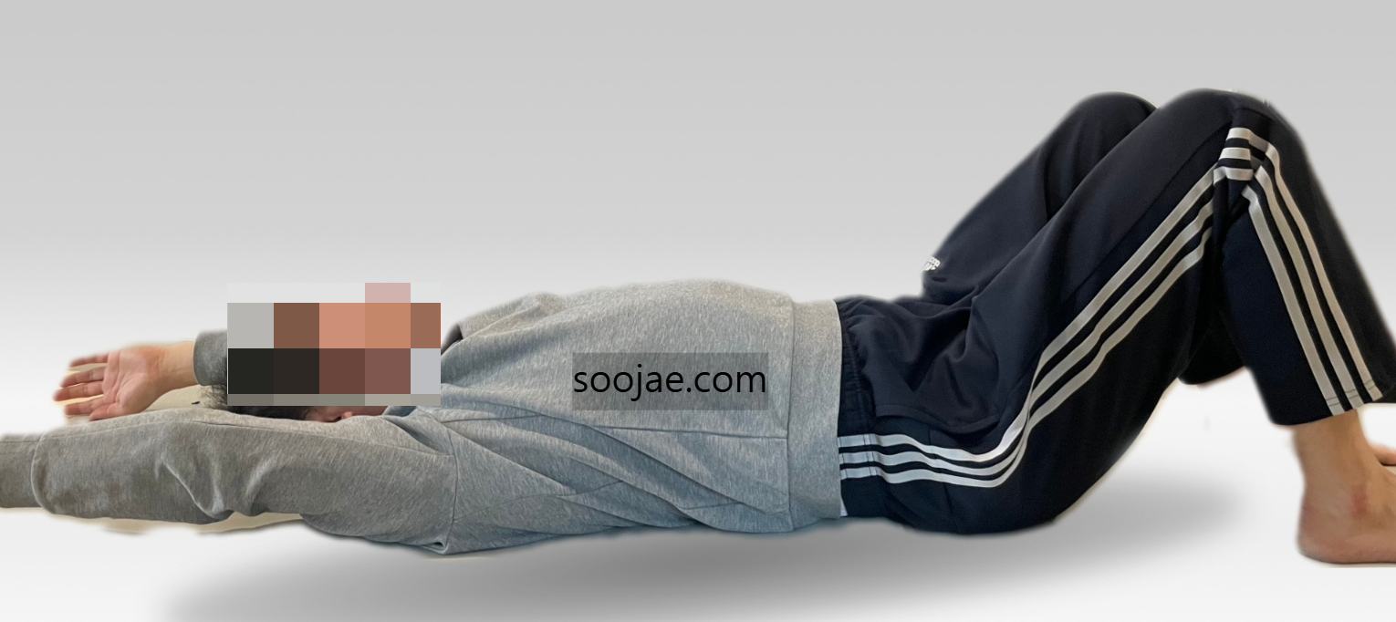 첫 번째 사진처럼 척추가 바닥에 붙었을 때 팔이 뜨거나, 두 번째 사진처럼 팔이 바닥에 붙어도 허리가 뜨게 되면 넓은등근이 짧은 것이다. 두 번째 사진으로 유추해 볼 수 있는 것은 넓은등근이 어깨나 목뿐만 아니라 허리에도 영향을 준다는 것을 알 수 있다.