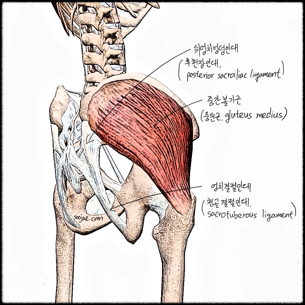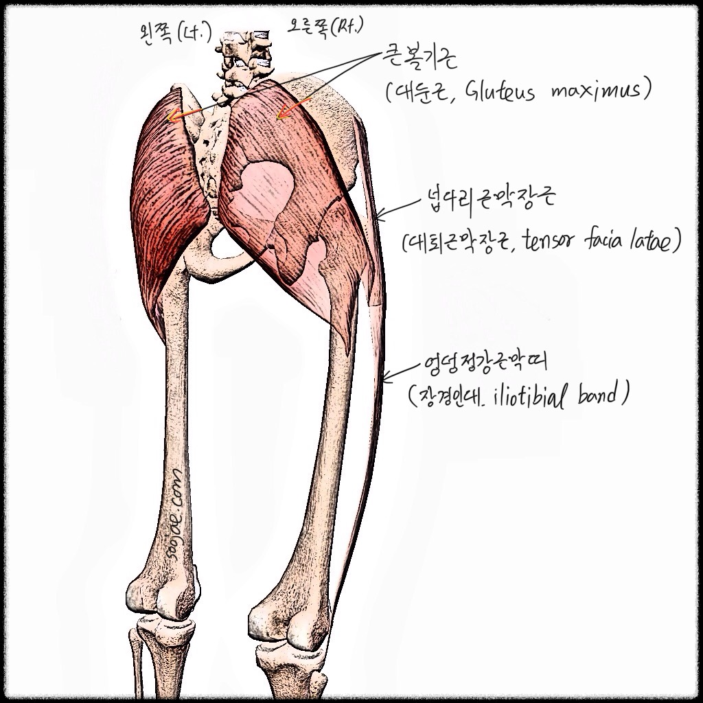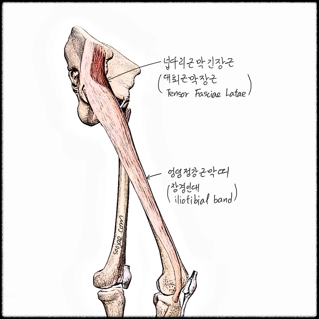 넙다리근막긴장근(대퇴근막장근, tensor fascia latae)은 흔히 말하는 '승마살' 부위를 관리할 때 핵심이 되는 근육이다. 이 근육은 엉덩관절과 무릎관절을 모두 지나며, 근육 자체는 짧고 엉덩정강근막띠(장경인대, iliotibial band)가 길게 이어지는 특징이 있다.엉덩관절에서는 굽힘, 벌림, 안쪽돌림 작용을 하며, 무릎관절에서는 가쪽돌림 작용을 한다. 이 근육이 과활성화되면 무릎을 구부릴 때 보상작용이 일어나고, 엉덩관절은 안쪽돌림, 무릎은 가쪽돌림 되는 현상이 나타난다.1. 해부학적 특징과 기능-이는곳은 위앞엉덩뼈가시의 앞-가쪽 부위이다. 이는 해부학적으로 전상장골극(anterior superior iliac spine)의 외측과 장골능 외순 절반에 해당한다. - 닿는곳은 엉덩정강근막..