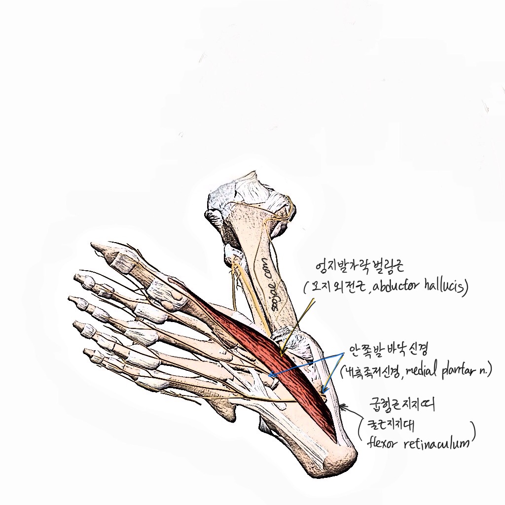 1. 서론엄지발가락벌림근 (모지외전근/Abductor Hallucis Muscle, AH)은 발의 발속근육 (내족근/Intrinsic Foot Muscles, IFM) 중 가장 표층에 위치하며 발의 안쪽 경계를 따라 현저한 융기부를 형성하는 근육이다. 이 근육은안쪽 발바닥 세로 활 (내측종족궁/Medial Longitudinal Arch, MLA)의 움직임 안정 (동적안정화/Dynamic Stabilization)에 결정적인 역할을 수행하는 핵심 요소로 인식된다. AH의 기능부전은 납작발 (편평족/Pes Planus), 엄지밖굽이증 (모지외반증/Hallux Valgus), 그리고 만성적인 족부 및 발목 통증 등 광범위한 근골격계 병변의 주요 원인 및 결과로 작용한다. 엄지발가락벌림근의 해부학적 중요성부..