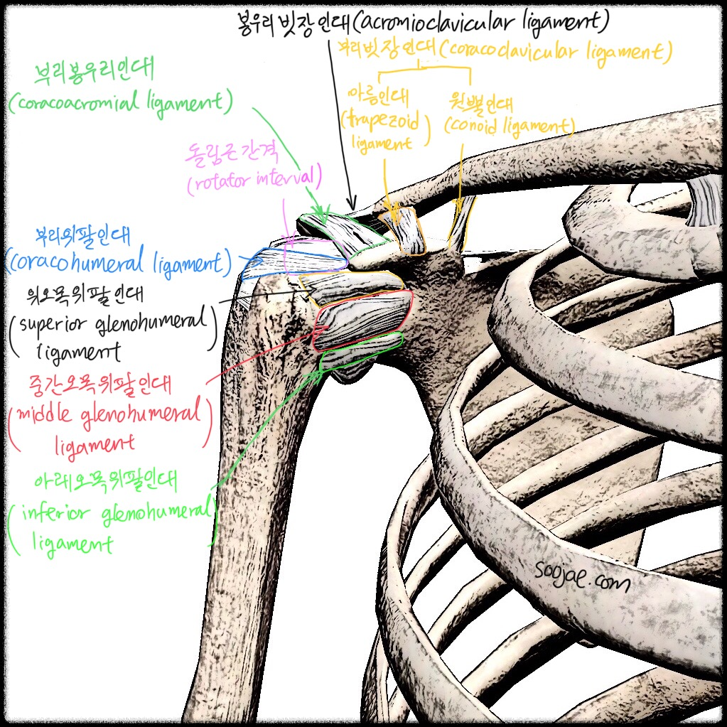 ---어깨 통증과 움직임: 인대의 중요성어깨의 움직임과 통증은 근육뿐만 아니라 인대에도 큰 영향을 받는다. 예를 들어, 근육에 이상이 없어도 인대에 문제가 있다면 어깨에 통증이 발생하고 움직임에 제한을 받게 된다. 그중 대표적인 질환이 유착성관절낭염(오십견, adhesive capsulitis)이다. 유착성관절낭염의 원인은 다양하지만, 이 질환으로 인해 어깨 인대와 연결된 겨드랑주머니(axillary pouch)가 줄어들어 움직임이 제한되는 경우가 많다. 그럼 지금부터 각 어깨 인대의 특징에 대해 자세히 알아보자.---1. 돌림근간격(rotator interval)돌림근간격은 인대의 특정 명칭은 아니다. 이곳은 어깨돌림띠를 이루는 근육들, 즉 가시위근(극상근, supraspinatus), 가시아래근(극하..